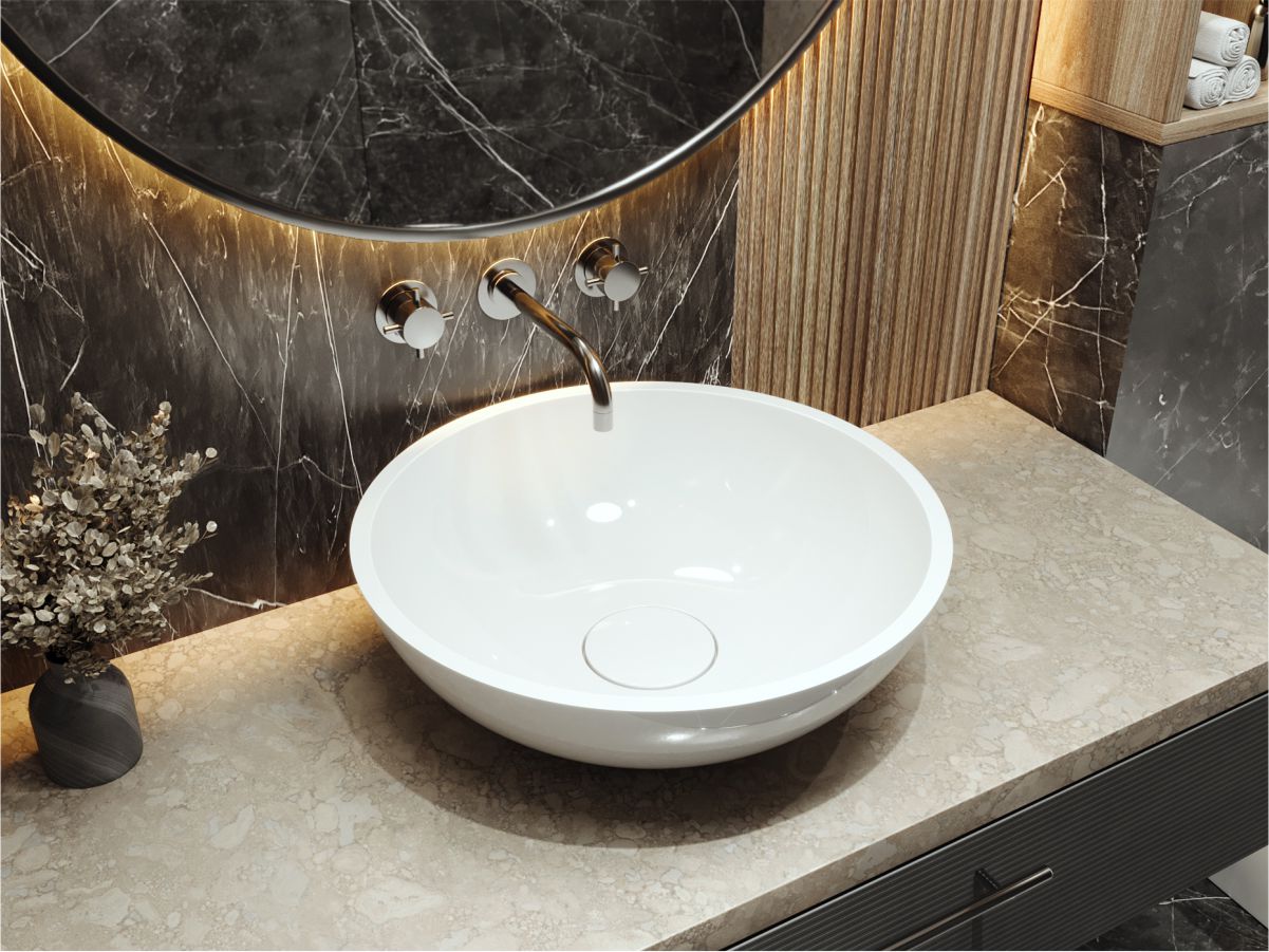 Глянцева раковина зі штучного каменю гармонійно доповнить дизайн сучасної ванної кімнати. Матеріал умивальника - Miramarble.