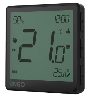 Це інноваційний Wi Fi термостат з вбудованим датчиком вологості, а також ідеальне поєднання сучасності з точною роботою та цікавим дизайном. Прилад надзвичайно простий для монтажу та в експлуатації. В основному призначений для керування системами теплої підлоги. Є можливість керування через бездротовий зв’язок, через додаток ENGO Smart, використовуючи інтернет-шлюз ZigBee 3.0 ENGO EGATEZB. Термостат живиться від вбудованого літій-іонного акумулятора. Завдяки специфіці роботи мережі ZigBee, вона споживає мало енергії, тому не потребує частої підзарядки.