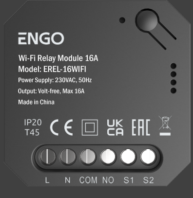 Продукт, розроблений для інтелектуального керування будь-яким пристроєм увімкнення/вимкнення. Вихід без напруги дозволяє керувати пристроями, які потребують схеми закриття або 230В. Ви можете використовувати EREL1WIFI16A для: відкривання/закривання гаражних/в’їзних воріт, управління освітленням, циркуляційним насосом центрального опалення, насосом ГВП, а також джерелом тепла – напр. газовим котлом або тепловим насосом (після конфігурації з іншими компонентами системи). Реле дозволяє встановити розклад роботи в програмі ENGO Smart або правила, у яких ввімкнення/вимкнення залежить від іншого пристрою (наприклад, увімкнення світла, коли датчик відкриття виявляє відкриті двері). Допустиме навантаження на контакти до 16А. Продукт дає можливість підключення датчика температури EFS300 (датчик NTC 10 кОм, продається окремо). Це дозволяє бачити виміряну температуру в додатку та створювати розумні сценарії залежно від цієї температури. Розмір модуля дозволяє розмістити його в монтажній коробці прихованого монтажу.