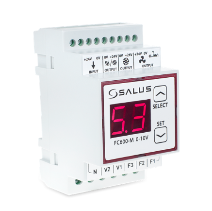 Salus FC600-M 0-10V модуль регулятора FC600, призначений для факойлів та клімаконвекторів з керуючим сигналом 0...10V. Це доповнення до регулятора SALUS FC600. Модуль плавно контролює швидкість обертання вентилятора встановлюючи напругу, що управляє, в діапазоні від 0 В до 10 В.