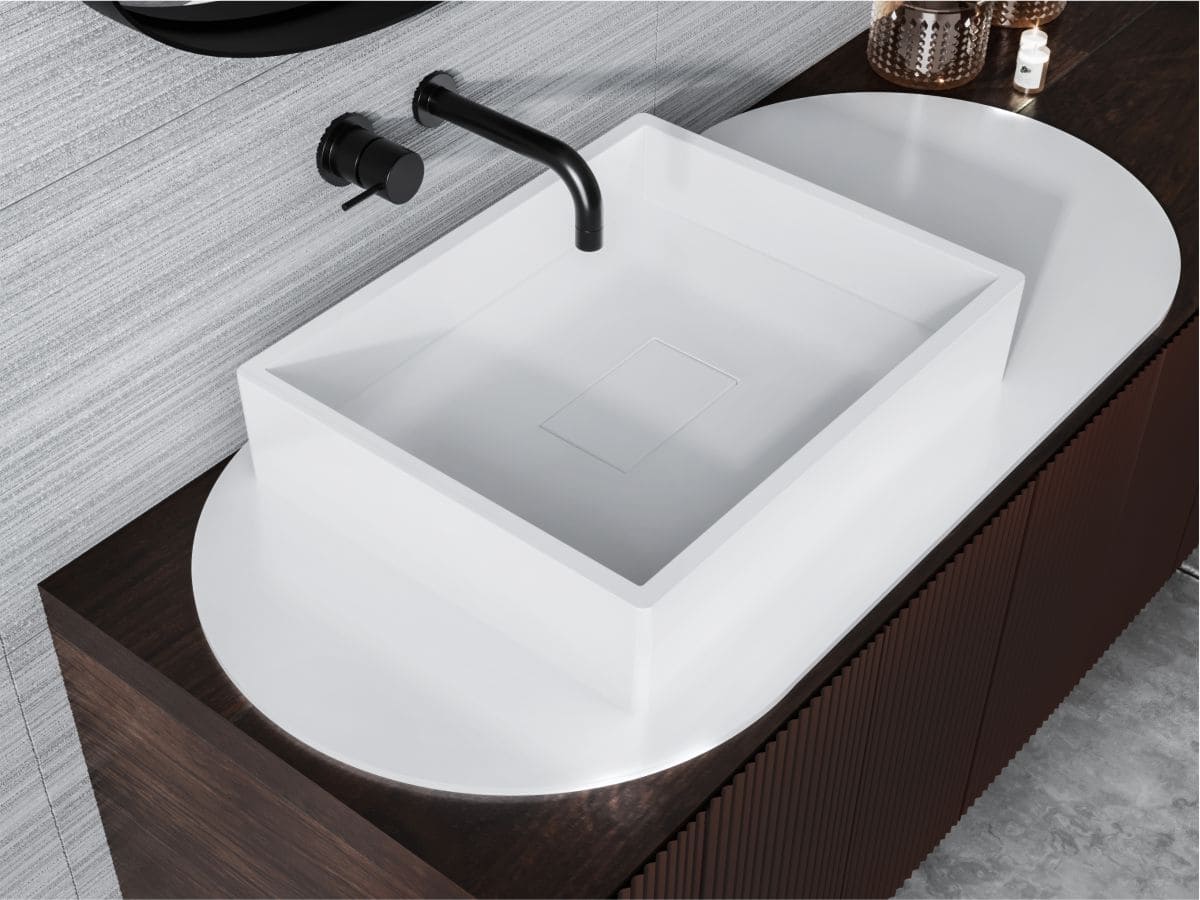 Глянцева раковина зі штучного каменю гармонійно доповнить дизайн сучасної ванної кімнати. Матеріал умивальника - Miramarble.