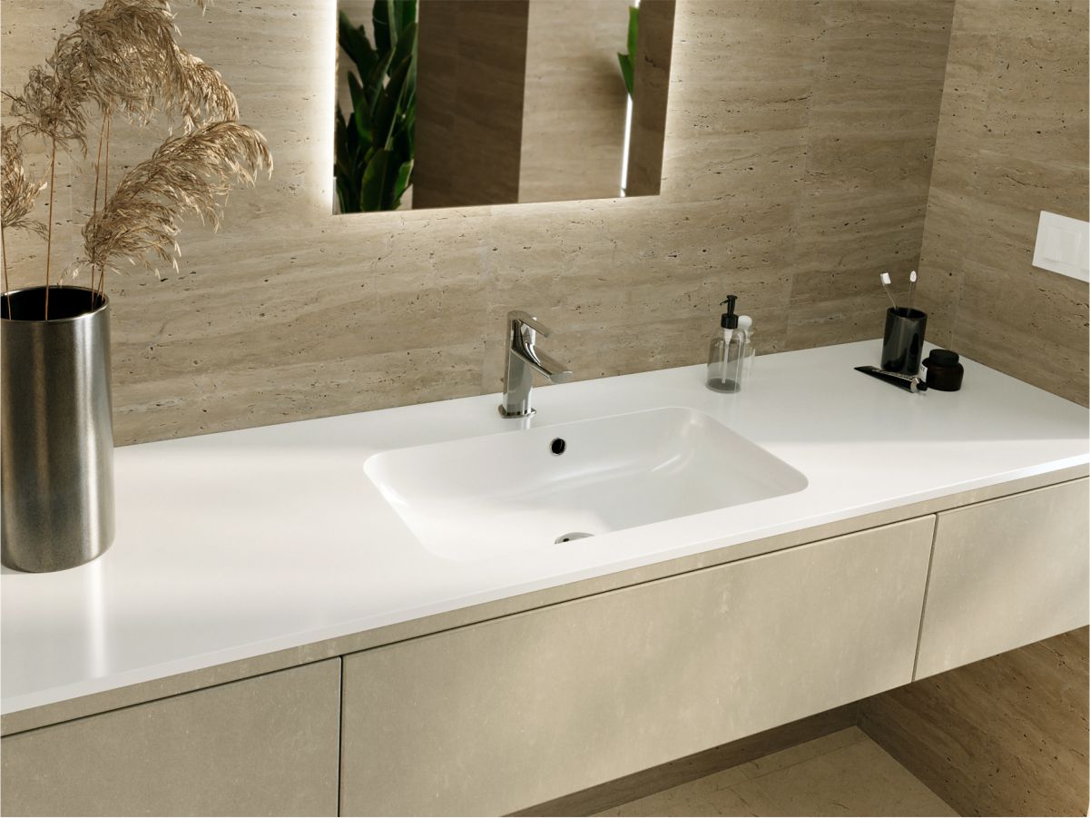 Прямокутна за формою чаші раковина має тип монтажу - накладний, врахуйте це перед замовленням меблів у ванну кімнату.