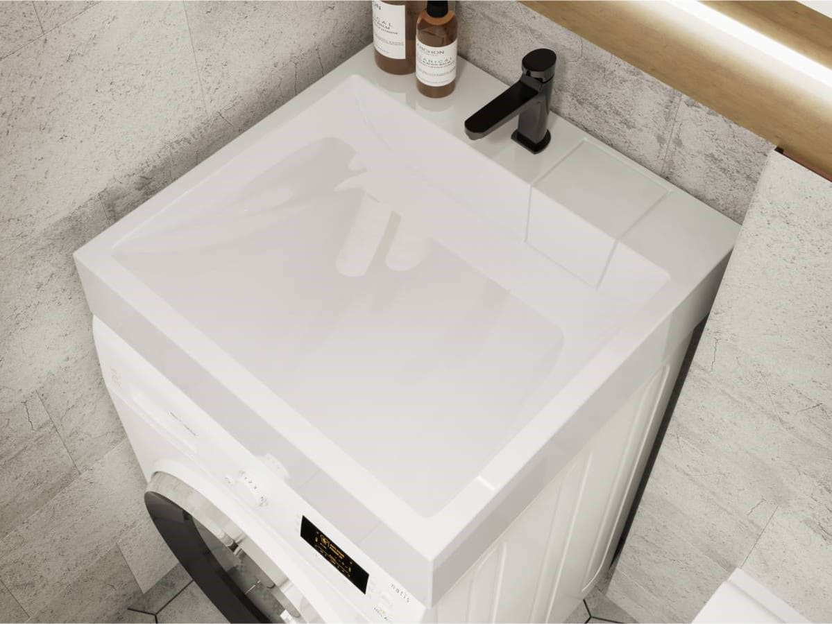 Прямокутна за формою чаші раковина має тип монтажу - підвісний;над пральною машиною, врахуйте це перед замовленням меблів у ванну кімнату.