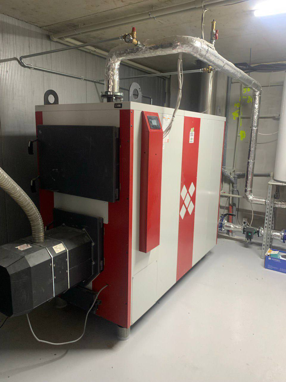 У котельному приміщенні виконано повний мотаж обладнання,гідравлічних вузлів,запірної арматури та автоматики.Усі магістральні труби теплоізольовано для мінімізації тепловтрат і забезпечення енергоефективності системи.