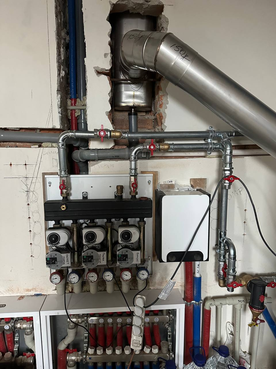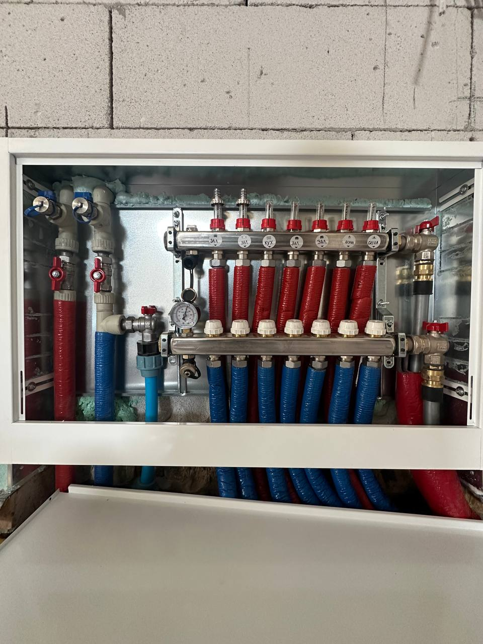 Після цього змонтовано розподільний колектор,який дозволяє регулювати кожен контур окремо та забезпечує стабільну роботу систему.