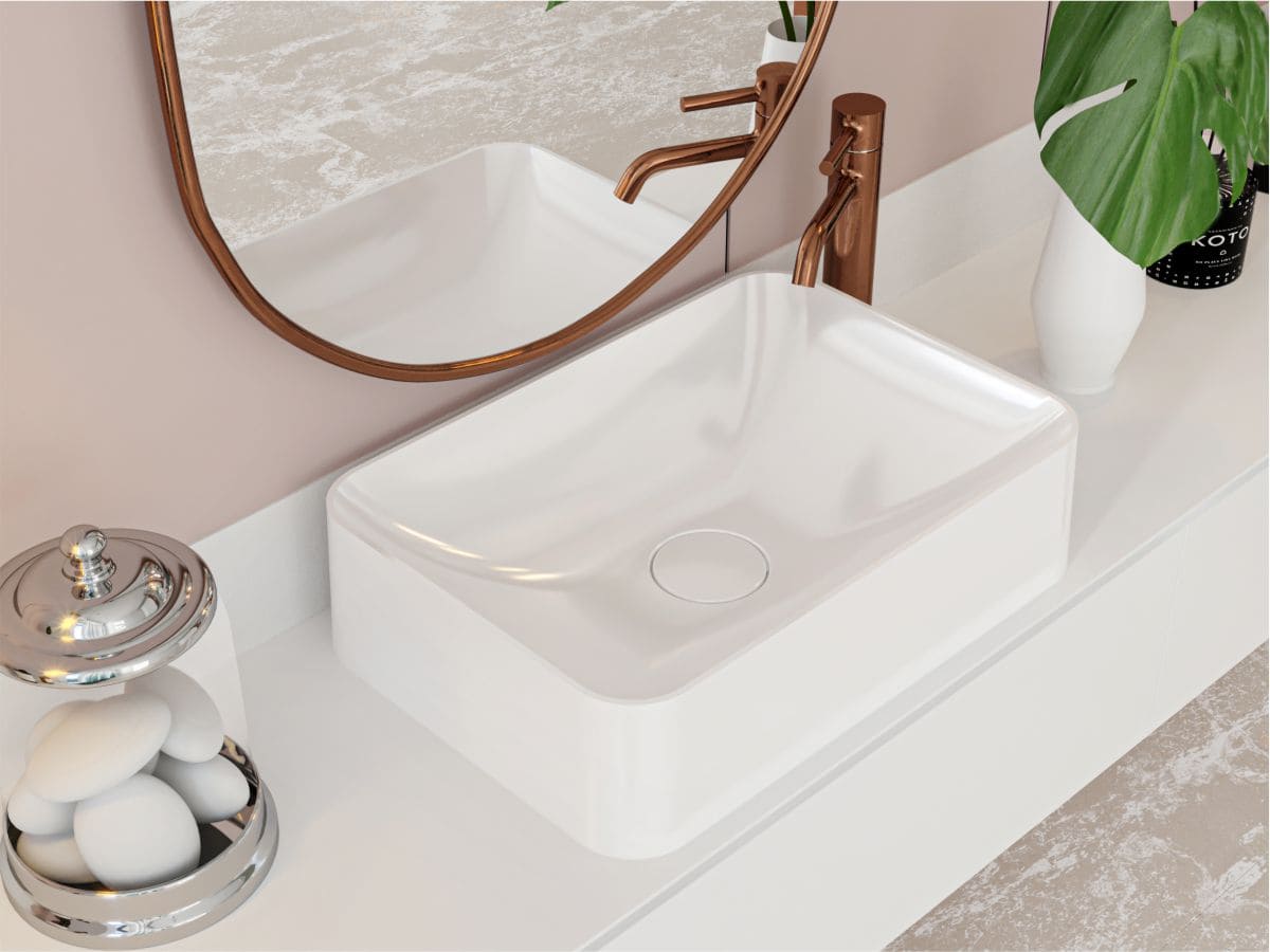 Прямокутна за формою чаші раковина має тип монтажу - накладний, врахуйте це перед замовленням меблів у ванну кімнату.